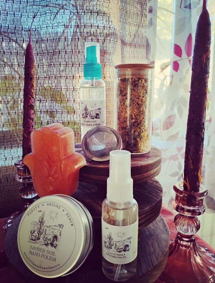Here, we walk with Lavender, Mugwort, Calendula, and Copal - allies of intuition, tenderness, and twilight remembering. These botanicals soften the heart, deepen the breath, and open the doorway to dream and vision, where ancestors whisper and the unseen becomes clear.